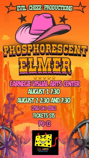 | PHOSPHORESCENT ELMER | Evil Cheez Productions | Carnegie Visual Arts Center | 8/1-8/2 |